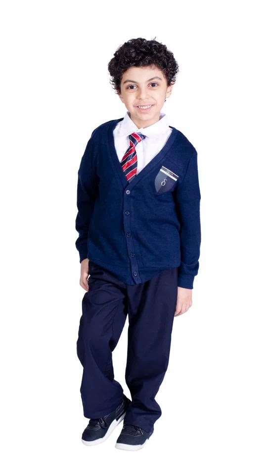 طقم كامل للأولاد خاص بمدارس دلتا العالمية (كي جي ) عبارة عن قميص أبيض وكرفتة وبنطلون كحلي وسويتر كحلي